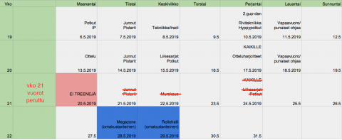 Kevään harjoittelukausi alkaa tulla päätökseensä ja viimeisille viikoille on hieman poikkeuksia luvassa. Nämä näkyvät oheisessa kausisuunnitelmassa.